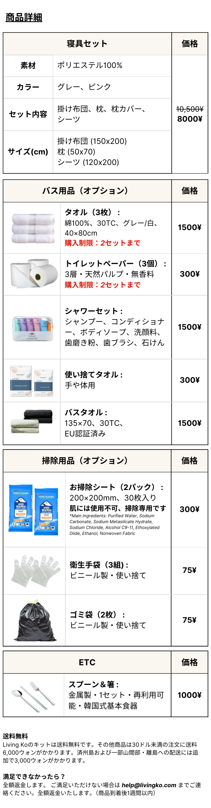 The Living Ko Kit is shipped free of charge. For other items, a shipping fee of 6,000 KRW is charged for orders under 30$. An additional fee of 3,000 KRW will be charged for shipments to Jeju and special mountainous and island regions.